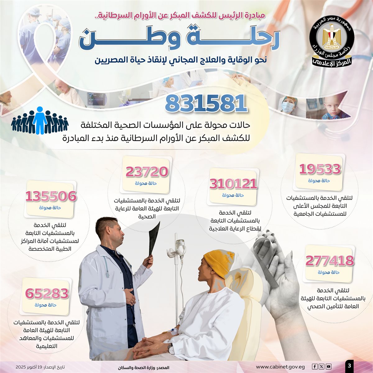 ورصدت الإنفوجرافات، إجمالي عدد الحالات المحولة على المؤسسات الصحية المختلفة للكشف المبكر عن الأورام السرطانية منذ بدء المبادرة، والتي بلغت 831581 حالة، مقسمة إلى 19533 حالة محولة لتلقي الخدمة بالمستشفيات التابعة للمجلس الأعلى للمستشفيات الجامعية، و310121 حالة محولة لتلقي الخدمة بالمستشفيات التابعة لقطاع الرعاية العلاجية.