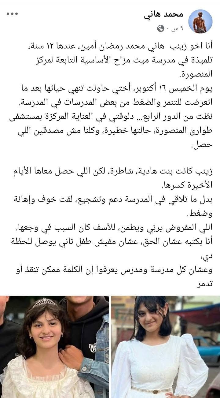 وأوضح محمد هاني في روايته: “يوم الخميس 16 أكتوبر، أختي وقعت من الدور الرابع في المدرسة.. نطّت بنفسها بعد أيام من المعاناة. دلوقتي في العناية المركزة بمستشفى طوارئ المنصورة، حالتها حرجة جدًا وربنا العالم بحالها”.
