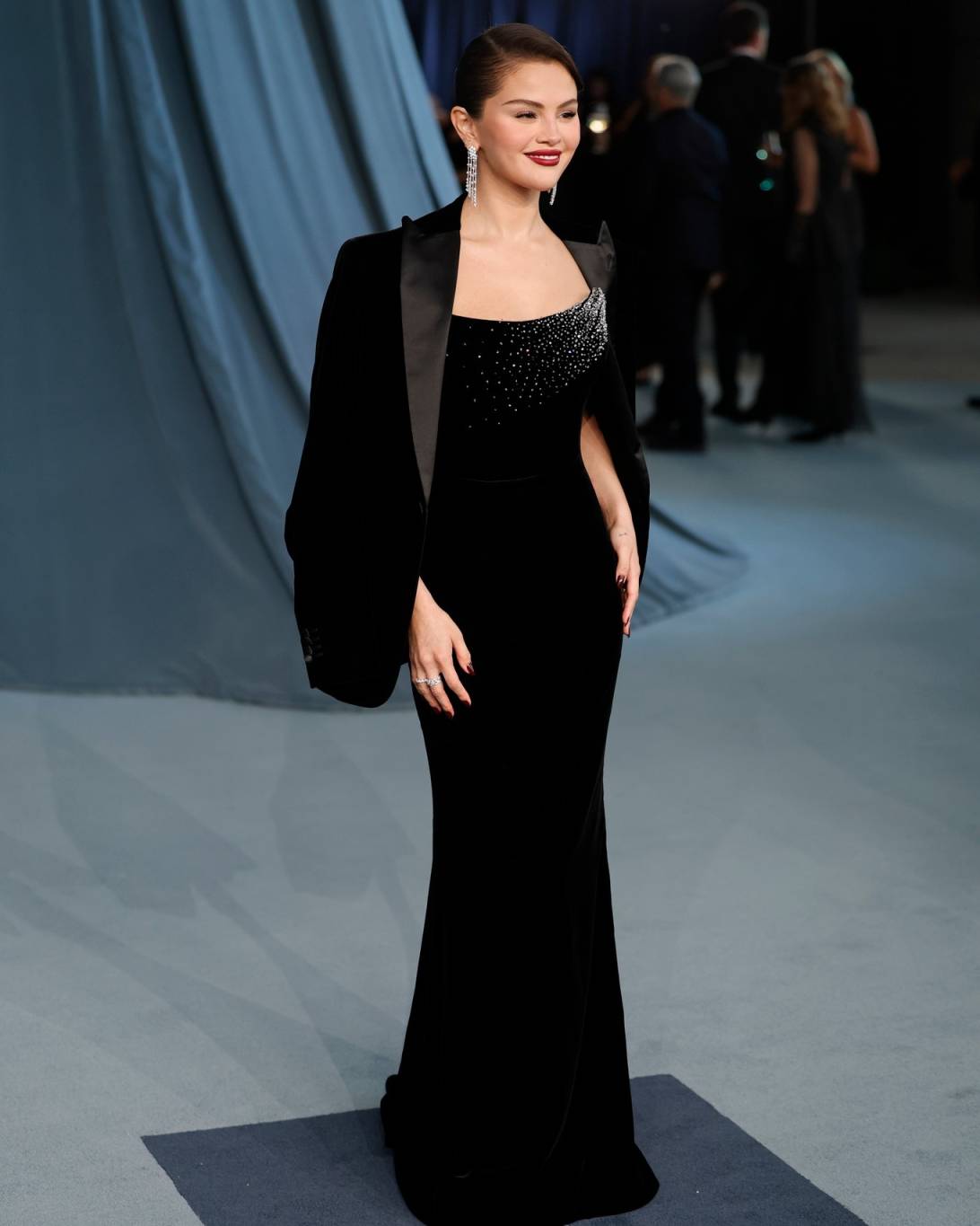 سيلينا جوميز وبيني بلانكو: أذهلت العروس، المتزوجة حديثًا، الجميع بفستان أسود مخملي ضيق مزين بكريستالات لامعة على الصدر، ارتدته تحت سترة رسمية متناسقة لإضفاء لمسة أنيقة. وانضم إليها زوجها بيني بلانكو، الذي أكمل إطلالتها ببدلة مخملية كحلية اللون وقميص حريري مفتوح، وأكمل إطلالتها بقلائد متعددة الطبقات.