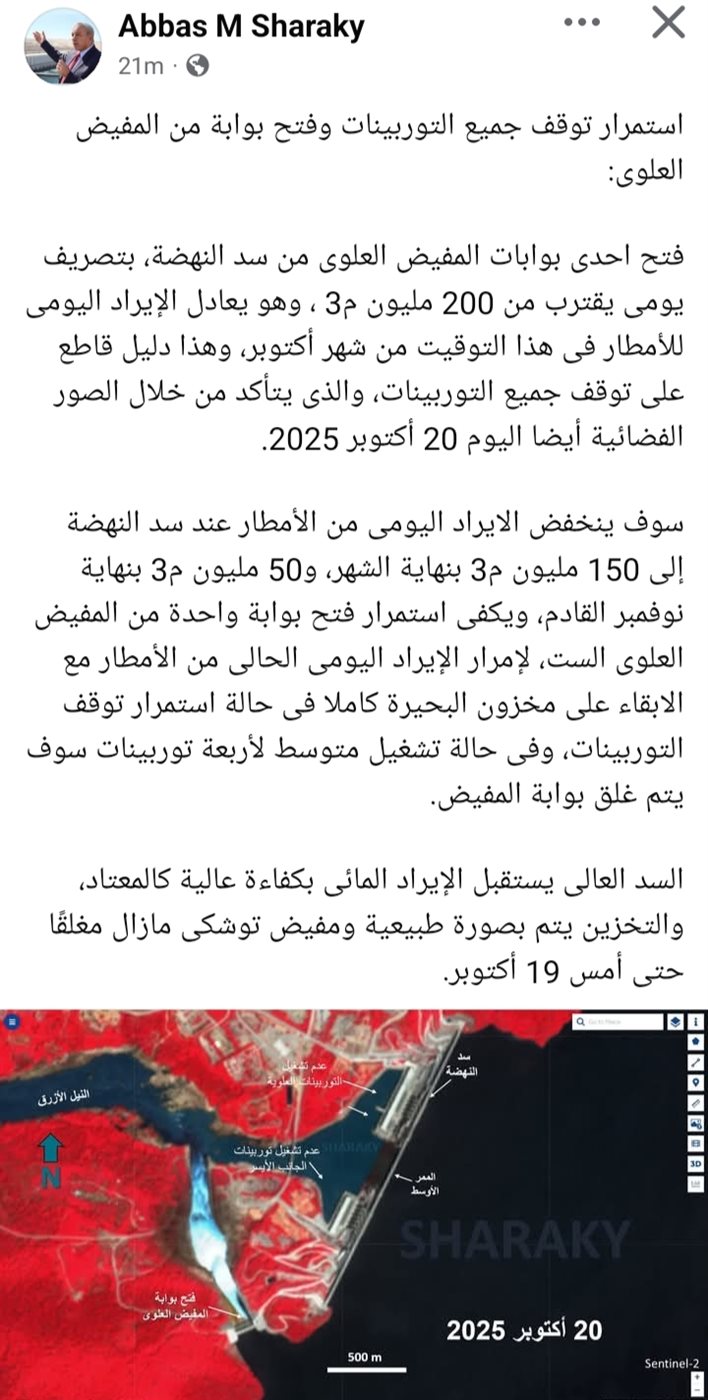 وأشار شراقي في منشور لهوعبر حسابه الرسمي على موقع التواصل الاجتماعي "فيسبوك" إلى فتح إحدى بوابات المفيض العلوى من سد النهضة، بتصريف يومى يقترب من 200 مليون م3 ، وهو ما يعادل الإيراد اليومى للأمطار فى هذا التوقيت من شهر أكتوبر، موضحًا أنَّ هذا دليل قاطع على توقف جميع التوربينات، والذى يتأكد من خلال الصور الفضائية أيضا اليوم 20 أكتوبر 2025.