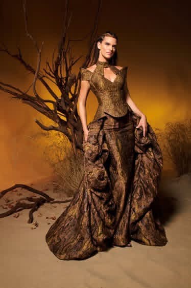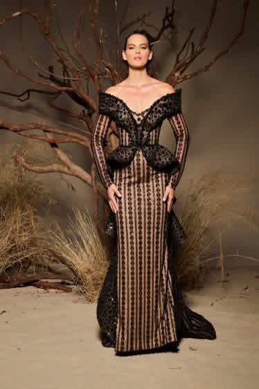 عملياً، تحتفي القصّات بجسد المرأة كفنٍّ حيوي، حيث تعكس كل انحناءة، شجاعة المرأة وحريتها وصلابتها. وتستحضر ألواناً قوية مثل الاسود والذهبي والبرونز، مستوحاة من المعادن، وعي القيمة المعنوية للطبيعة، فيما أضيفت لمعاناً استثنائياً عبر أحجار تتلألأ فوق الخامات، في تطريز يضفي أنوثة وحيوية.