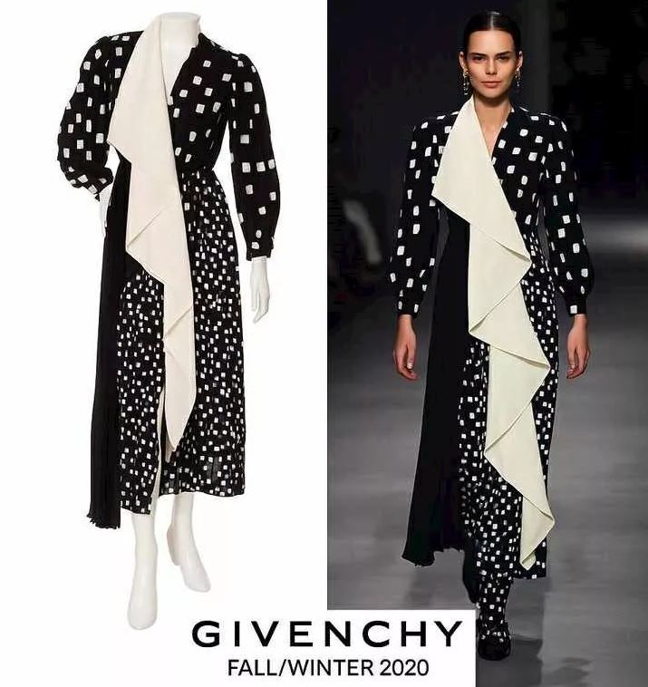 والفستان مصنوع من الحرير الطبيعي، بنقشة polka dots بالأبيض والأسود على النصف الأيسر، بينما يهيمن على النصف الأيمن اللون الأبيض النقي مع طبقات ruffles غير متماثلة تنساب بانسيابية لافتة، مانحة الإطلالة حركة ديناميكية.