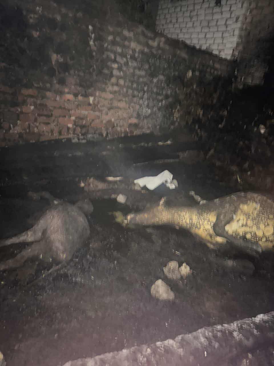 تم الدفع بسيارات الإطفاء إلى مكان الحريق وتبين بعد الفحص حريق في حوش ماشية ونفوق بقرة وجاموسة و3 أغنام وإصابة سعدالدين.ك، يبلغ من العمر 70 عامًا بسبب الحريق.