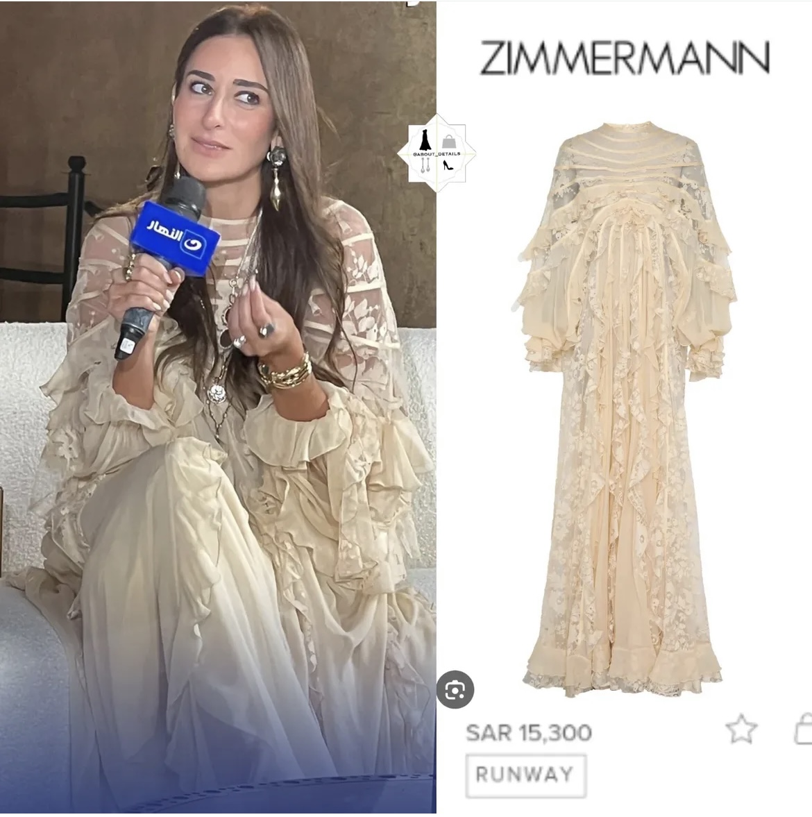 أمّا الفستان فارتدت تصميم فلورال ذهبي غني بالطبقات من توقيع Zimmerman ويبلغ سعره حوالي 4,000 دولار أمريكي.