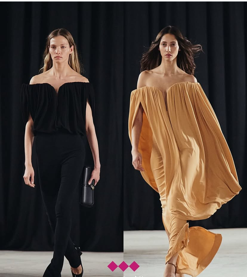لم تكن لوحة الألوان متنوعة بالقدر الذي رصدناه في أسبوع باريس، ولكنها عكست نعومة التصاميم، وخدمت مبدأ الاستدامة، ففي خلفية ظللها الفضي اللامع والأسود الملكي والأزرق الفيروزي الترابي، تهادت العارضات بأزياء فخمة، رغم بساطة قصاتها، ولكن أكثر ما لفتنا الأصفر؛ الذي جذب الأنظار بمجرد مرور العارضة على المنصة بفستانها الساتان الميدي طويل الأكمام، المنسق مع صندل بكعب عالٍ رفيع من اللون ذاته، إطلالة ناعمة ترجمت هوية الماركة المعنية بالأزياء العملية، التي ترافق النساء العصريات من الصباح إلى المساء، ويمكن تنسيقها بأكثر من طريقة، مما يشجع على الحد من الشراء.