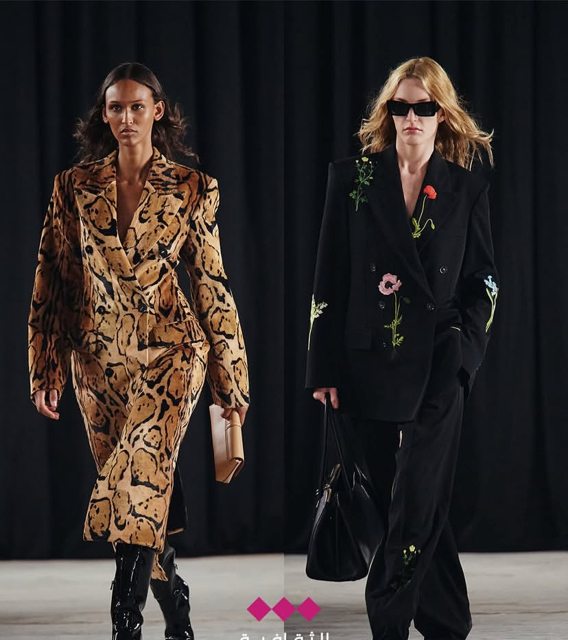 أهدت ستيلا مكارتني للمرأة العربية، المشهورة بعشقها للتفاصيل الثرية والطبعات القوية، سلسلة من الإطلالات المزيّنة بالنقوش البرية، والتي سبق وشاهدنا مثلها في مجموعتها لخريف وشتاء 2025، فأحببنا الفستان مرتفع الياقة المطبع بنقشة الأفعى، والمعطف الميدي الذي أعقبه؛ المميز بكتفيه العريضتين، والأزرار التي تزين الجهتين، والمنسق مع أحذية بوت طويلة تتخطى الركبة، منفذة من جلد لامع صديق للبيئة.