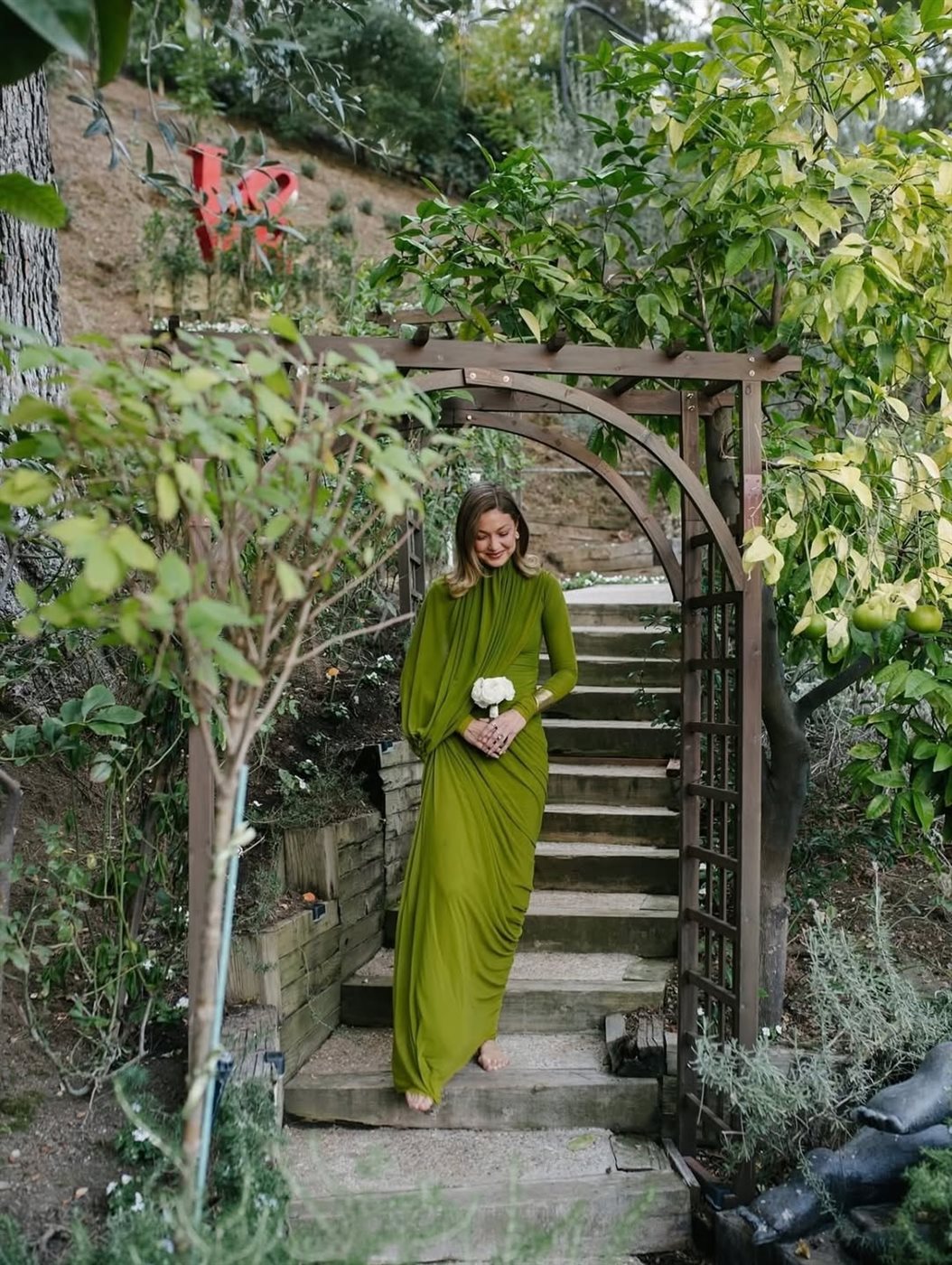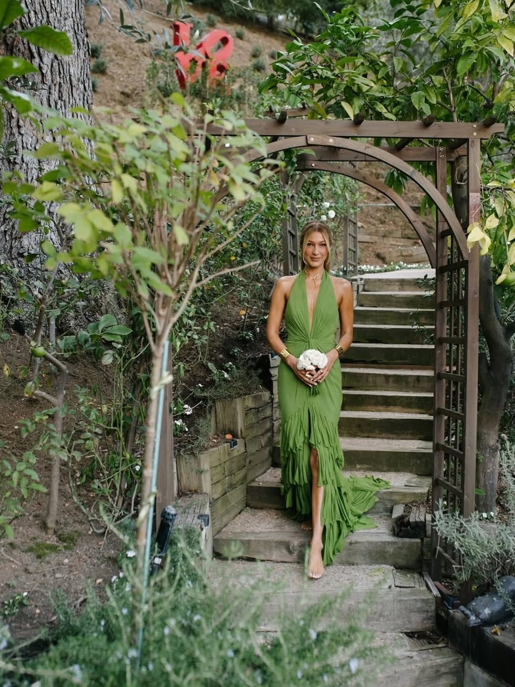 اختارت جيجي فستاناً ماكسي عالي الرقبة بأكمام منسدلة مزيّنة بأساور ذهبية.