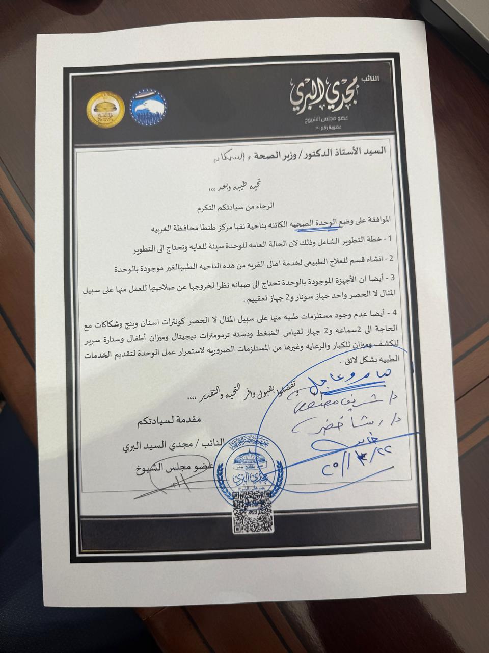 وأشار عضو مجلس الشيوخ إلى أن وزير الصحة أبدى استجابة فورية، ووجّه بالتأشير على الطلب بـ”العام والعاجل” لسرعة اتخاذ الإجراءات اللازمة لتجديد الوحدة الصحية ودعمها بالإمكانات المطلوبة.