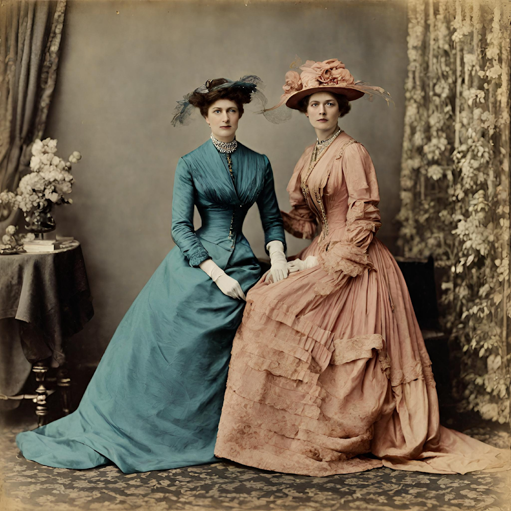 وكانت موضة تلك الفترة تتميّز باعتماد النساء تنانير طويلة تصل إلى الأرض مع قبعات ضخمة مزيّنة بالريش المرتّب واللافت.