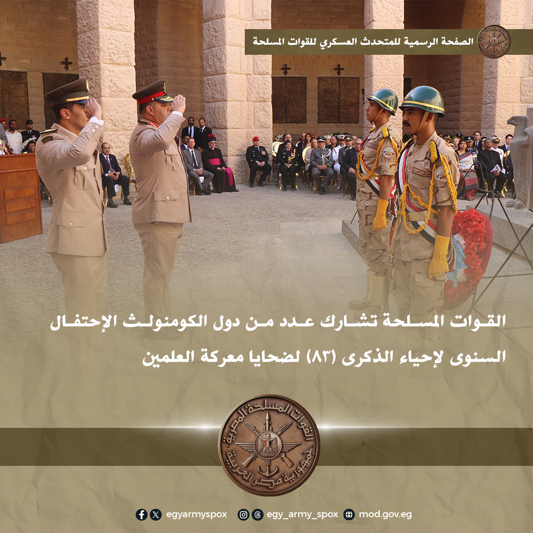 شاركت القوات المسلحة دول ( ألمانيا - بريطانيا - إيطاليا - اليونان ) مراسم الاحتفال السنوى لإحياء الذكرى (83) لضحايا معركة العلمين، والتى دارت أحداثها بمسرح عمليات مدينة العلمين عام 1942، وذلك بحضور عدد من قادة القوات المسلحة ووفود رفيعة المستوى من الدول المشاركة وأسر الضحايا بمقر النصب التذكارى لمقابر الكومنولث بمدينة العلمين.