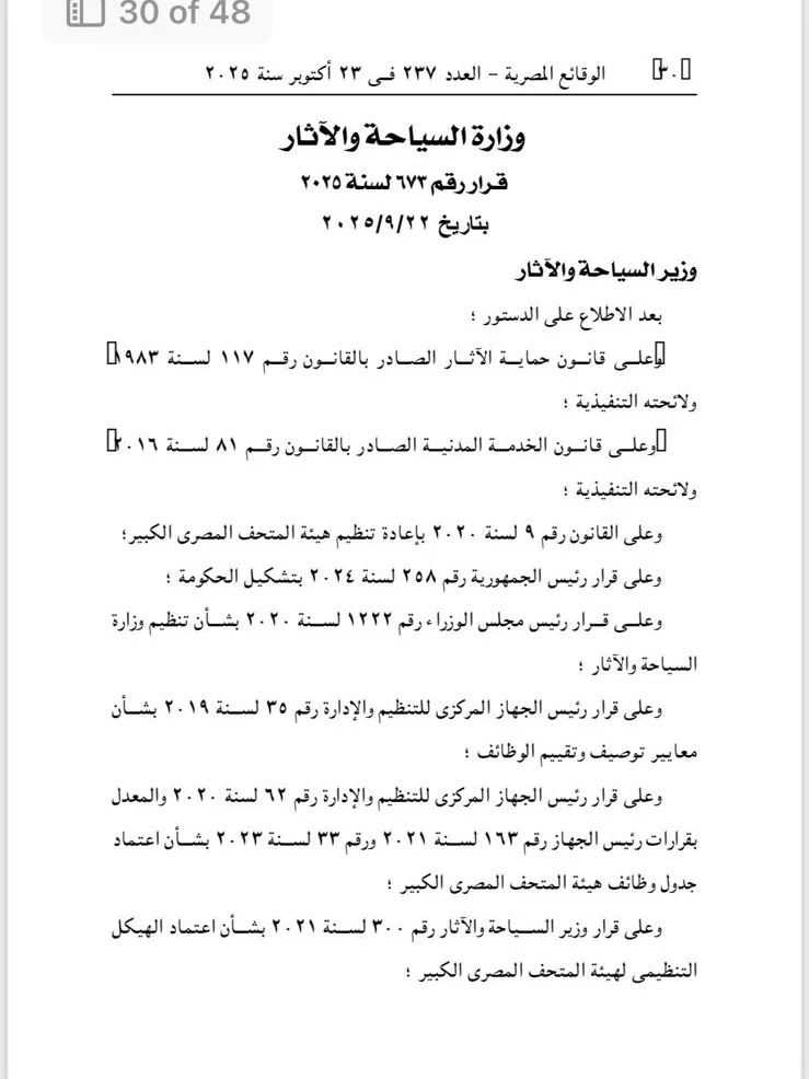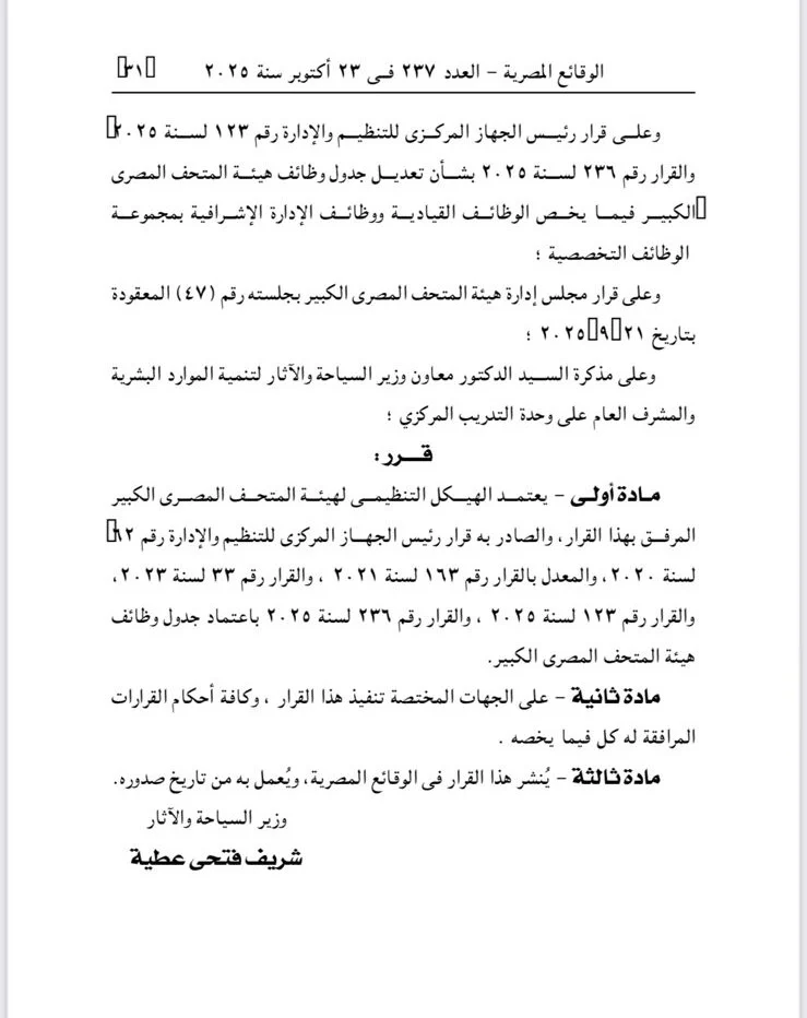 وجاء القرار وذلك استنادًا إلى قرار رئيس الجهاز المركزي للتنظيم والإدارة رقم 62 لسنة 2020، وتعديلاته المتتالية الصادرة بالقرارات أرقام 163 لسنة 2021، و33 لسنة 2023، و123 لسنة 2025، و236 لسنة 2025، والمتعلقة باعتماد جدول وظائف هيئة المتحف المصري الكبير.