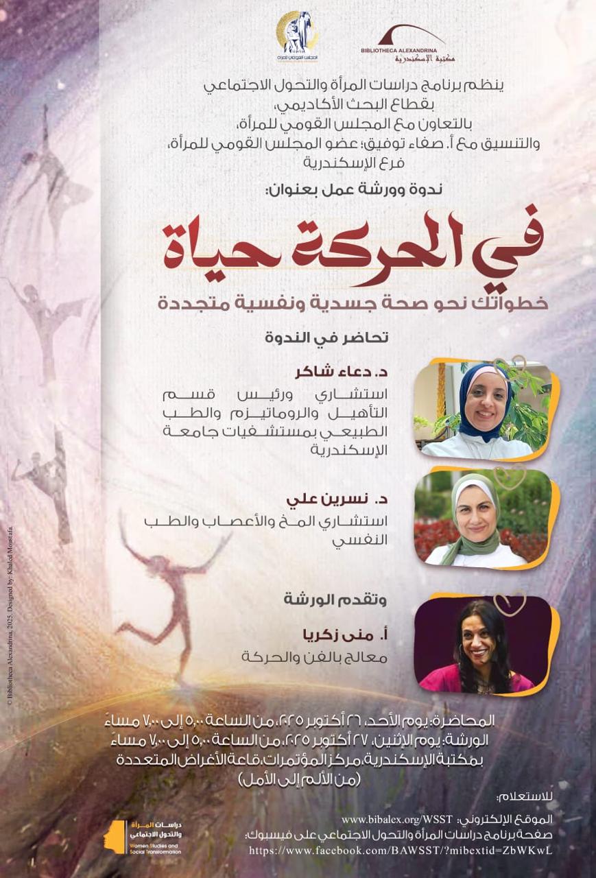 تنظم مكتبة الإسكندرية من خلال برنامج دراسات المرأة والتحول الاجتماعي بقطاع البحث الأكاديمي، بالتعاون مع المجلس القومي للمرأة، وبالتنسيق مع الأستاذة صفاء توفيق، عضو المجلس القومي للمرأة فرع الإسكندرية، ندوة وورشة عمل بعنوان "في الحركة حياة: خطواتك نحو صحة جسدية ونفسية متجددة"، وذلك يوم الأحد الموافق 26 أكتوبر 2025 من الساعة الخامسة حتى السابعة مساءً، بقاعة الأغراض المتعددة بمركز مؤتمرات مكتبة الإسكندرية.