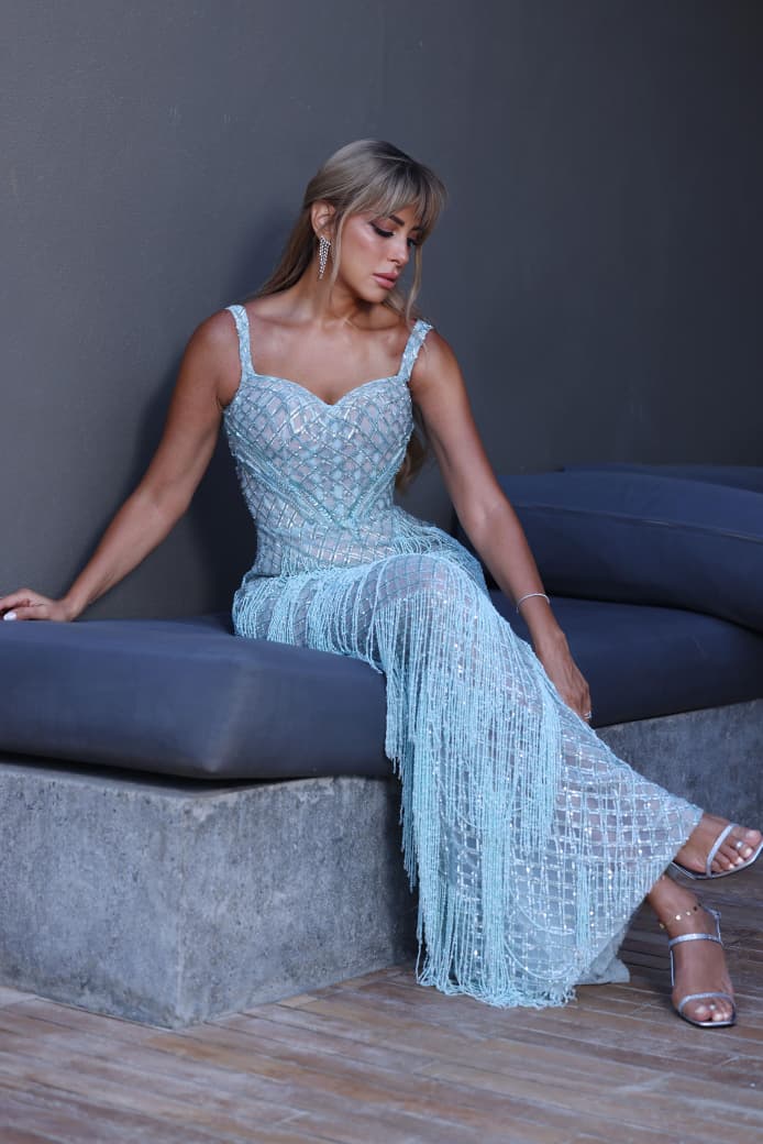 وظهرت ريم بفستان أزرق ثلجي مرصّع بالخرز والتطريزات البراقة مع تفاصيل من الشراريب اللامعة التي منحت الإطلالة حركة انسيابية مفعمة بالحيوية، في تصميم يجمع بين الفخامة والأنوثة الراقية.