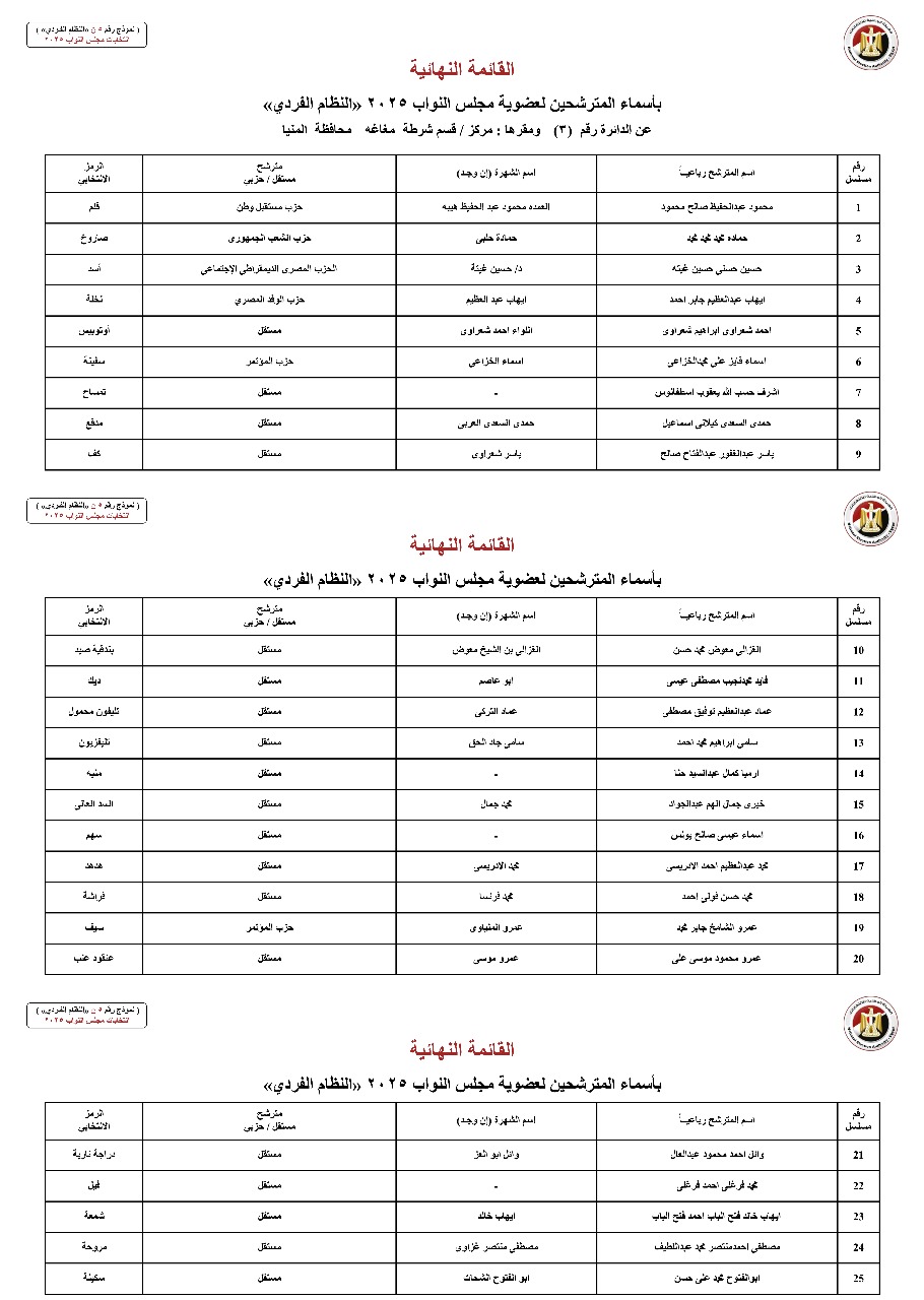 الهيئة الوطنية تعلن أسماء مرشحي الفردي بالمنيا في انتخابات البرلمان 2025