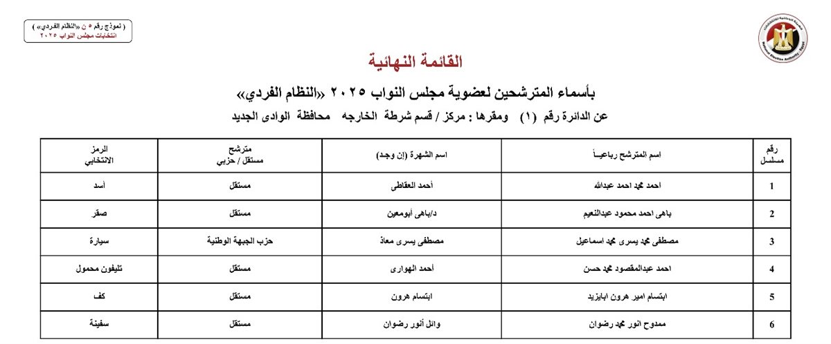 أعلنت الهيئة الوطنية للانتخابات برئاسة القاضى حازم بدوى، منذ قليل أسماء المرشحين على النظام الفردى لانتخابات مجلس النواب 2025 فى محافظة أسيوط، حيث يتنافس 28 مرشحا على المقاعد.