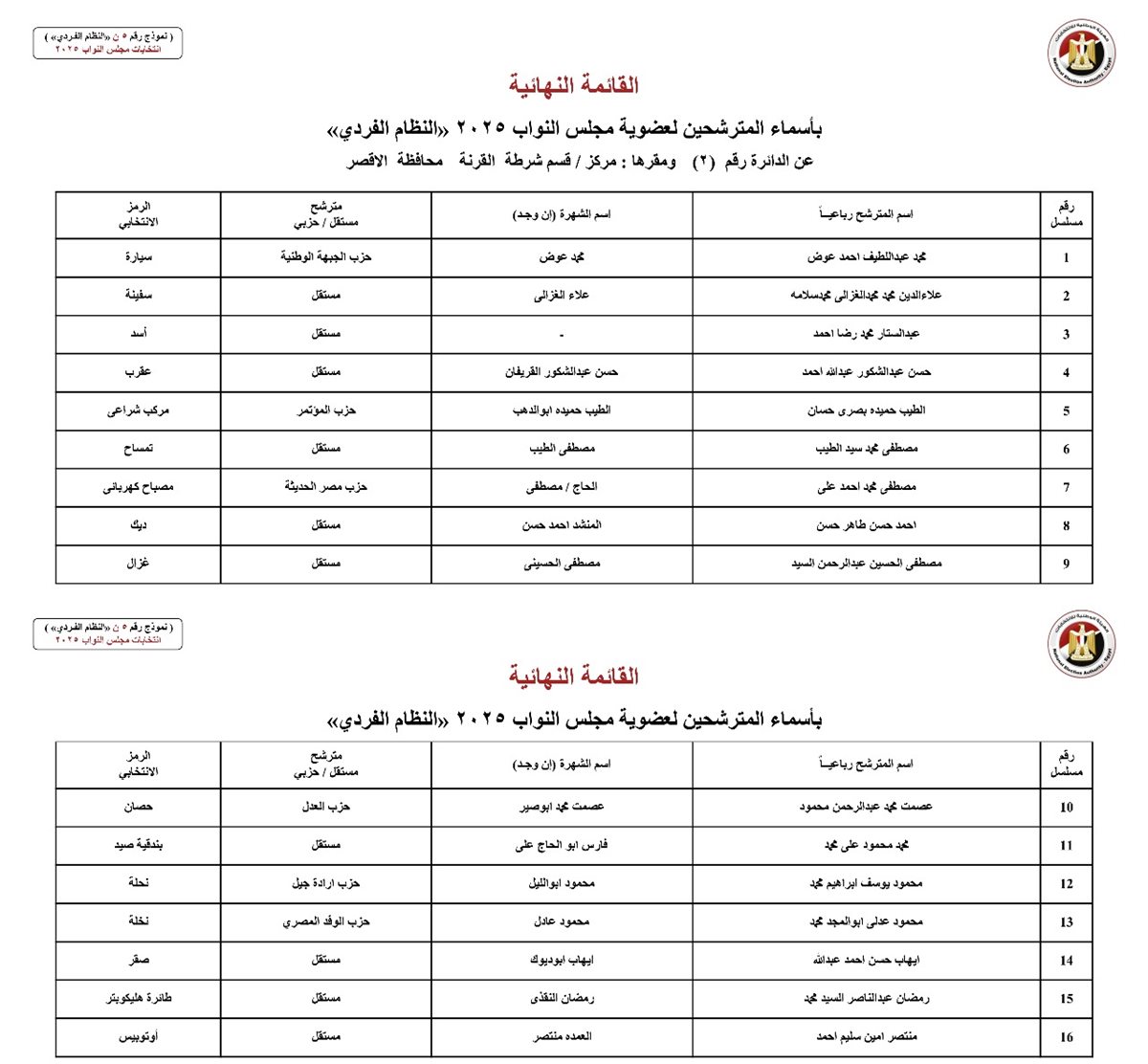 إعلان قائمة مرشحي النظام الفردي لانتخابات البرلمان 2025 بالاقصر رسميًا