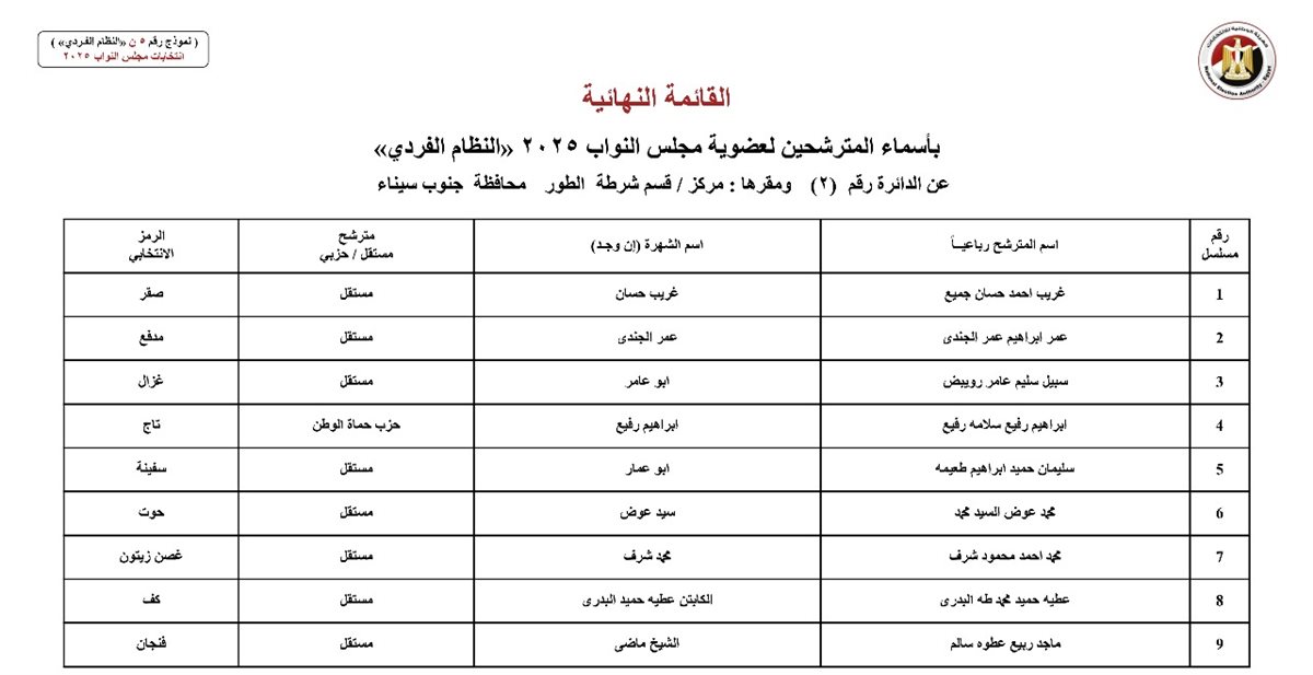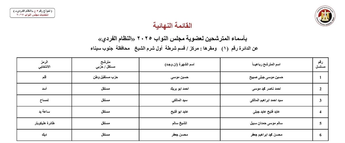 الكشف الرسمي عن مرشحي النظام الفردي يشعل المنافسة الانتخابية بجنوب سيناء 2025