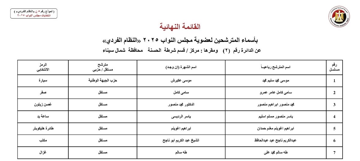 أعلنت الهيئة الوطنية للانتخابات برئاسة القاضى حازم بدوى، منذ قليل أسماء المرشحين على النظام الفردى لانتخابات مجلس النواب 2025 بمحافظة شمال سيناء .