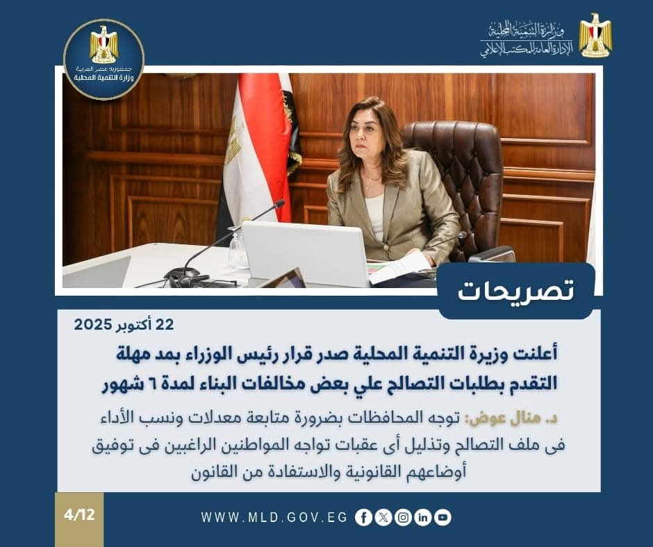 وأعلنت الوزيرة عن صدور قرار رئيس مجلس الوزراء رقم 3766 لسنة 2025 بمد فترة التصالح في مخالفات البناء لمدة ستة أشهر إضافية تبدأ من 5 نوفمبر 2025، مراعاةً للبعد الاجتماعي والتيسير على المواطنين.