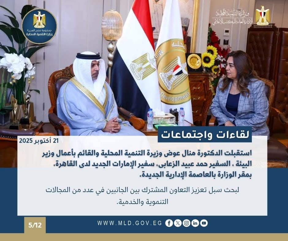 كما استقبلت الوزيرة السفير حمد عبيد الزعابي، سفير الإمارات الجديد لدى القاهرة، لبحث سبل التعاون في مجالات التدريب والتحول الرقمي وتطوير الخدمات المحلية، بالإضافة إلى التعاون في جائزة مصر للتميز الحكومي.