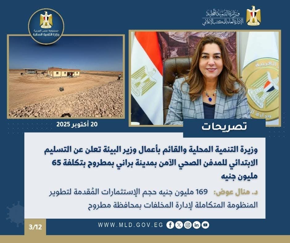 أعلنت الدكتورة منال عوض عن التسليم الابتدائي للمدفن الصحي الآمن بمدينة براني بمحافظة مطروح بتكلفة 65 مليون جنيه، في إطار تنفيذ المنظومة المتكاملة لإدارة المخلفات الصلبة وفقًا لتوجيهات القيادة السياسية.