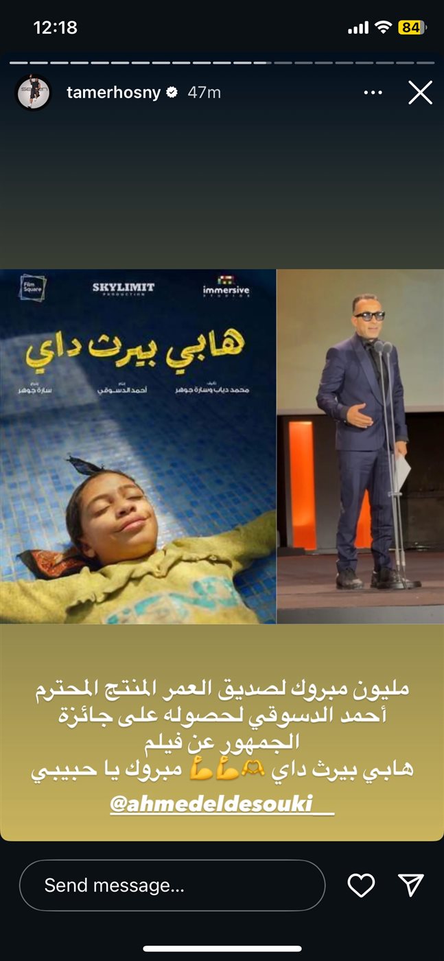 حيث نشر تامر حسني منشورًا له عبر خاصية الإستوري على حسابه الرسمي بموقع تبادل الصور والفيديوهات إنستجرام، وقال: “مليون مبروك لصديق العمر المنتج المحترم أحمد الدسوقي، لحصوله على جائزة الجمهور عن فيلم هابي بيرث داي، مبروك يا حبيبي”.
