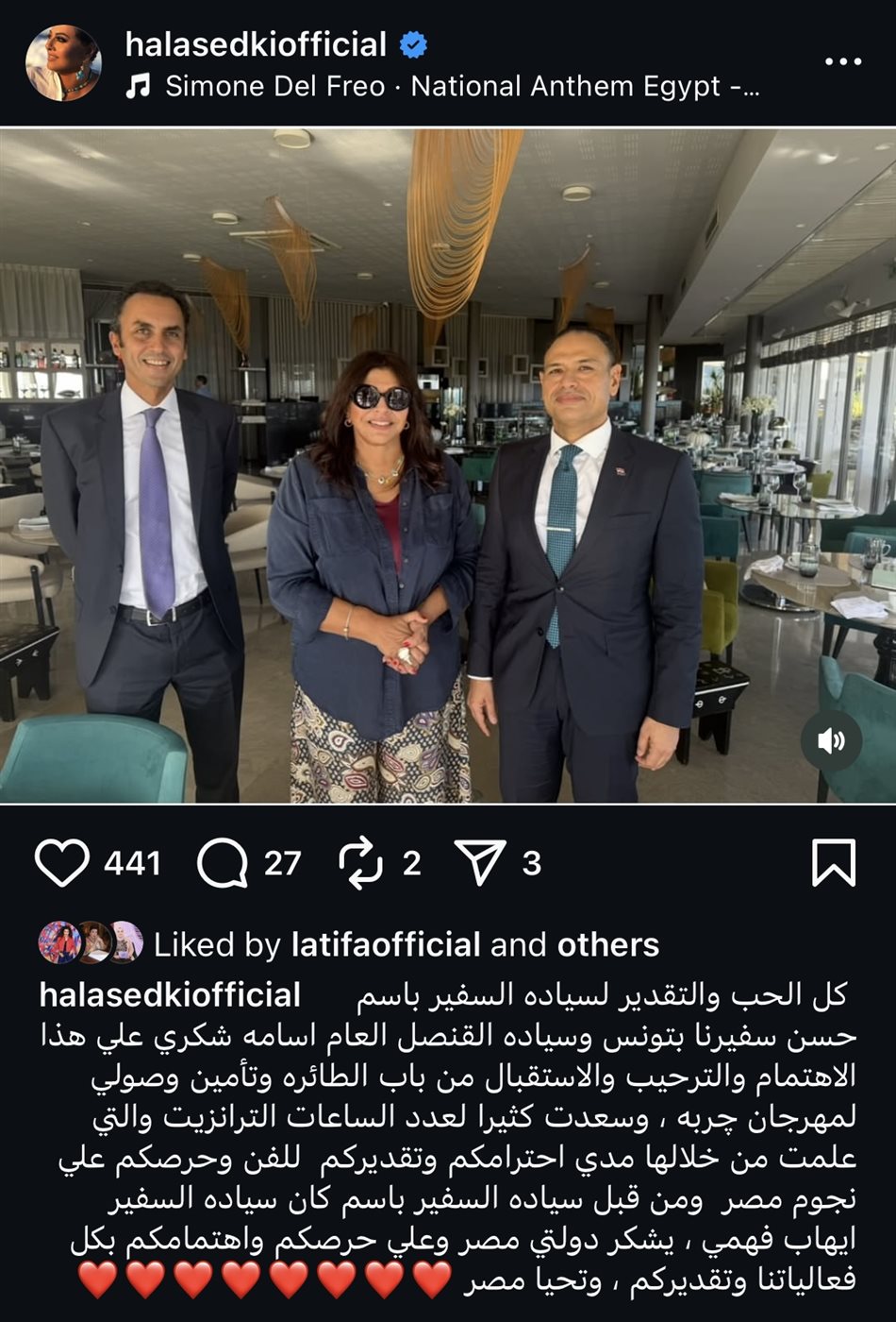 حرصت الفنانة هالة صدقي على توجيه الشكر لسفير مصر بتونس، وذلك من خلال منشورًا عبر حسابها الرسمي على موقع تبادل الصور والفيديوهات إنستجرام.