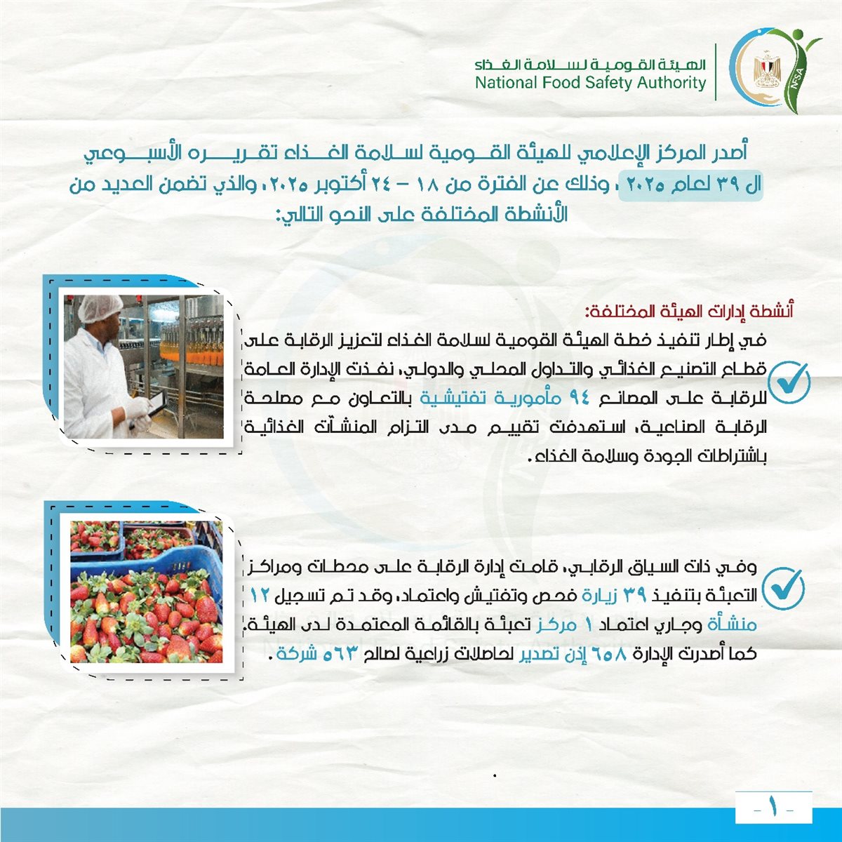 أصدر المركز الإعلامي للهيئة القومية لسلامة الغذاء تقريره الأسبوعي الـ 39 لعام 2025، وذلك عن الفترة من 18 - 24 أكتوبر، والذي تضمن العديد من الأنشطة المختلفة على النحو التالي: