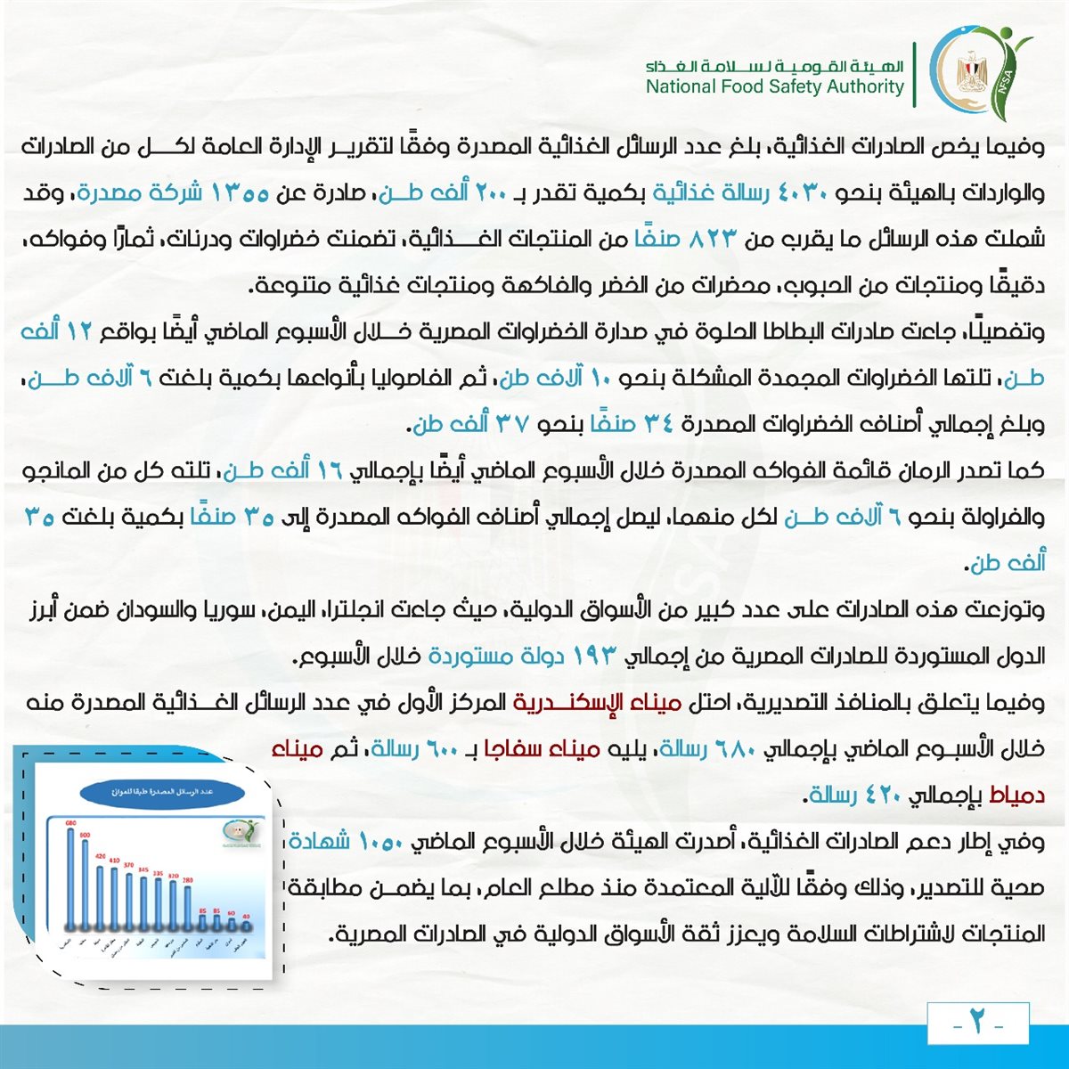 وفيما يتعلق بالمنافذ التصديرية، احتل ميناء الإسكندرية المركز الأول في عدد الرسائل الغذائية المصدرة منه خلال الأسبوع الماضي بإجمالي 680 رسالة، يليه ميناء سفاجا بـ 600 رسالة، ثم ميناء دمياط بإجمالي 420 رسالة.