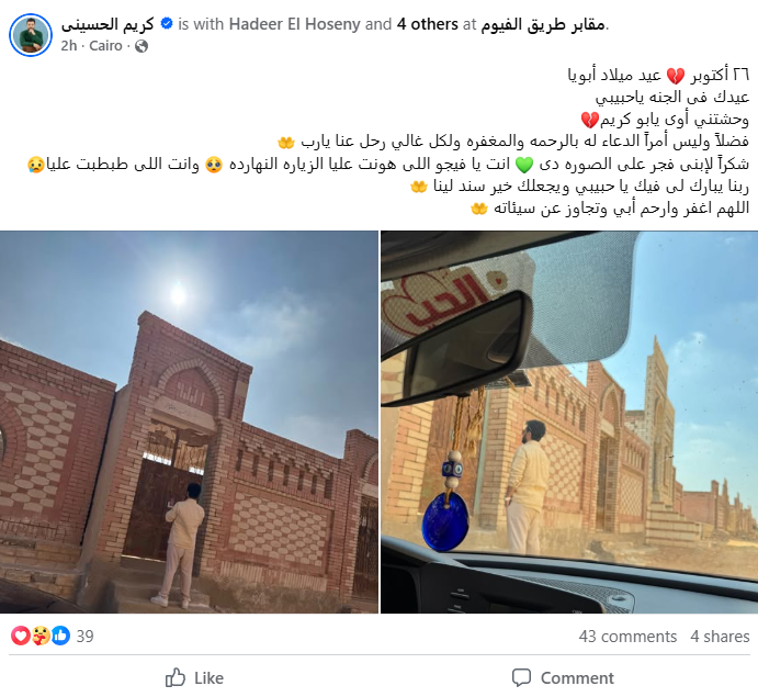 وعلق كريم الحسيني على الصور قائلًا: “ 26 أكتوبر عيد ميلاد أبويا، عيدك فى الجنه يا حبيبي، وحشتني أوى يا أبو كريم، فضلاً وليس أمراً الدعاء له بالرحمة والمغفرة ولكل غالي رحل عنا يارب، شكراً لابنى فجر على الصورة دى، أنت يا فيجو اللى هونت عليا الزيارة النهاردة، وانت اللى طبطبت عليا، ربنا يبارك لى فيك يا حبيبي ويجعلك خير سند لينا، اللهم اغفر وارحم أبي وتجاوز عن سيئاته”.