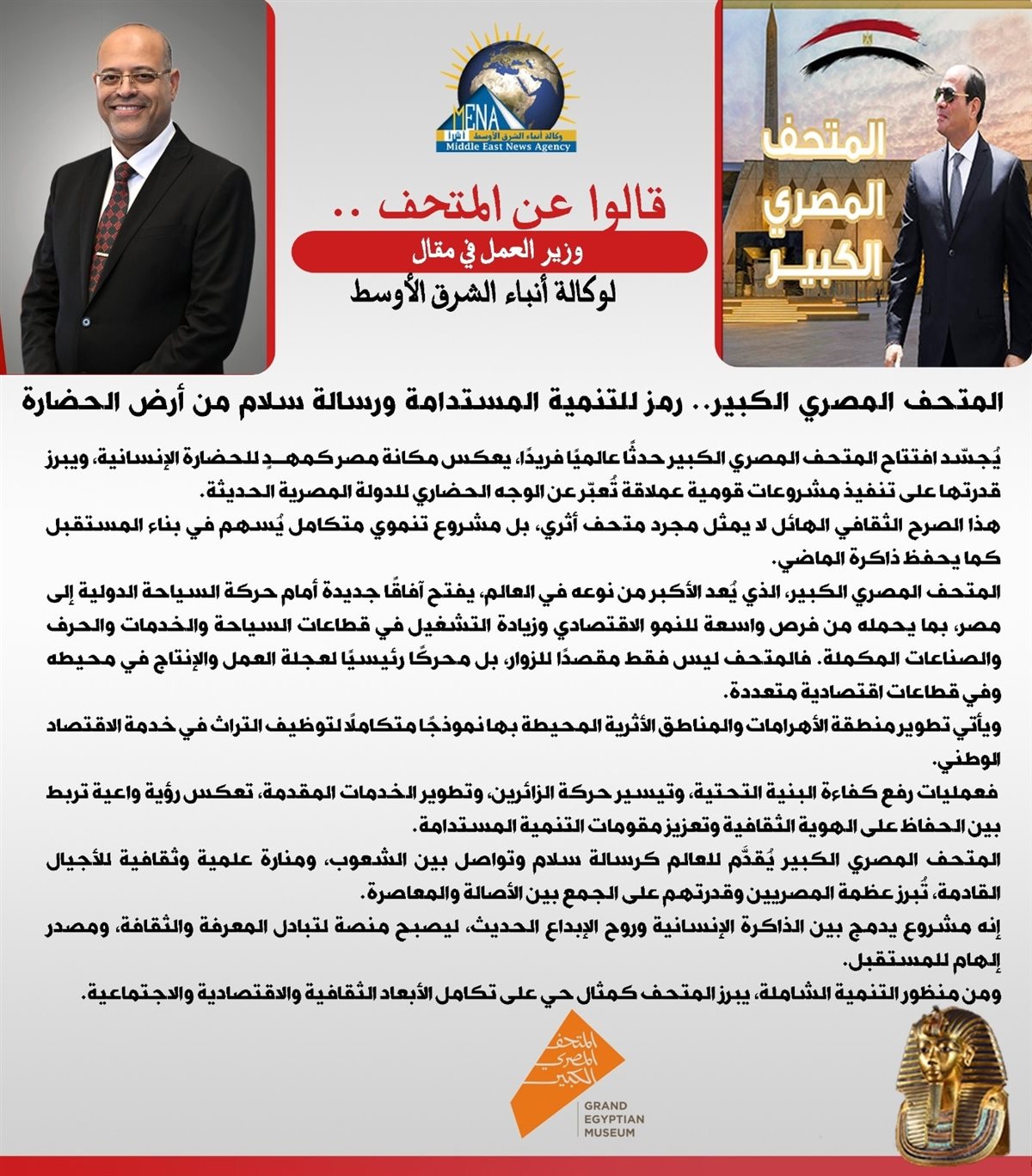 كتب وزير العمل مقالا لوكالة أنباء الشرق الأوسط بعنوان .. المتحف المصري الكبير.. رمز للتنمية المستدامة ورسالة سلام من أرض الحضارة.