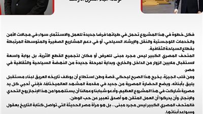 واختتم حديثه قائلًا إن المتحف المصري الكبير هو منارة جديدة للحضارة الإنسانية، ودليل على أن التنمية الحقيقية لا تقتصر على البناء المادي، بل تشمل الإنسان، والمعرفة، والذاكرة التاريخية المشتركة التي توحد بين الشعوب.