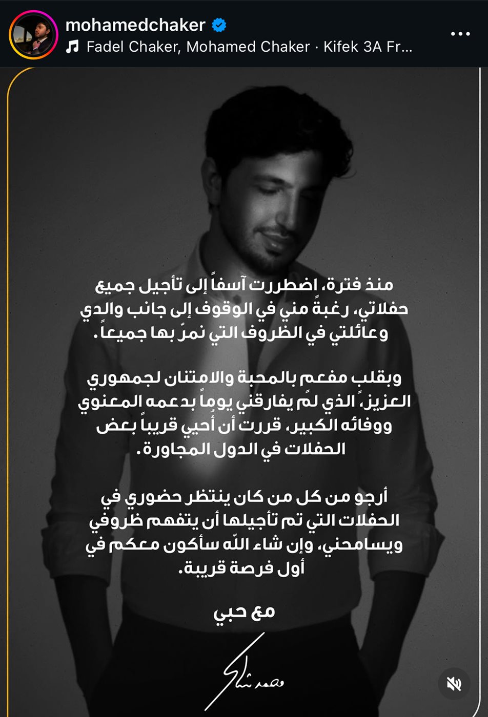 وكتب نجل فضل شاكر، عبر حسابه الرسمي على موقع التواصل الإجتماعي انستجرام: منذ فترة، اضطررت آسفًا إلى تأجيل جميع حفلاتي، رغبة مني في الوقوف إلى جانب والدي وعائلتي في الظروف التي نمر بها جميعًا، وبقلب مفعم بالمحبة والامتنان لجمهوري العزيز الذي لم يفارقني يوما بدعمه المعنوي ووفائه الكبير، قررت أن أحيي قريبا بعض الحفلات في الدول المجاورة.