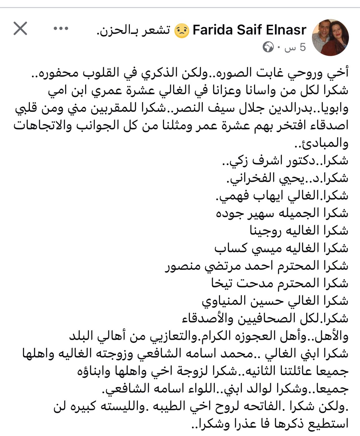 نشرت الفنانة فريدة سيف النصر منشورا عبر صفحتها الرسمية تشكر فيه كل من واساها في عزاء شقيقها الذي رحل عن عالمنا صباح الأحد الماضي ، وحرصت على توجيه الشكر للدكتور أشرف زكي بشكل خاص وبعض نجوم الفن الذين وقفوا بجانبها خلال الفترة الصعبة الماضية التي مرت بها .