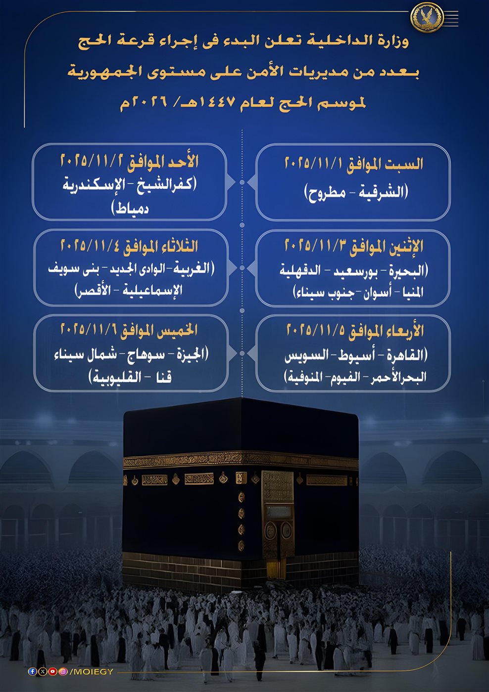أعلنت وزارة الداخلية في إطار الاستعدادات لموسم حج 1447هـ/2026م، عن بدء إجراء قرعة الحج في عدد من مديريات الأمن على مستوى الجمهورية.