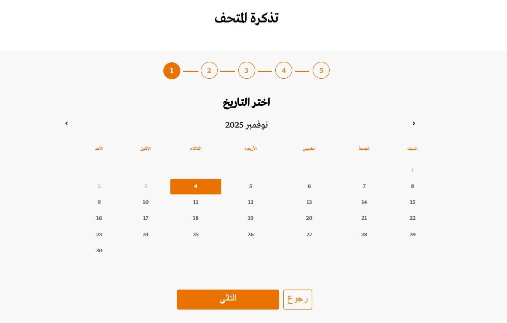 يتيح موقع المتحف المصري الكبير الحجز الإلكتروني بداية من يوم الثلاثاء الموافق 4 نوفمبر 2025، ويمكن للراغبين سواء داخل أو خارج مصر الحجز أون لاين من خلال الخطوات التالية: