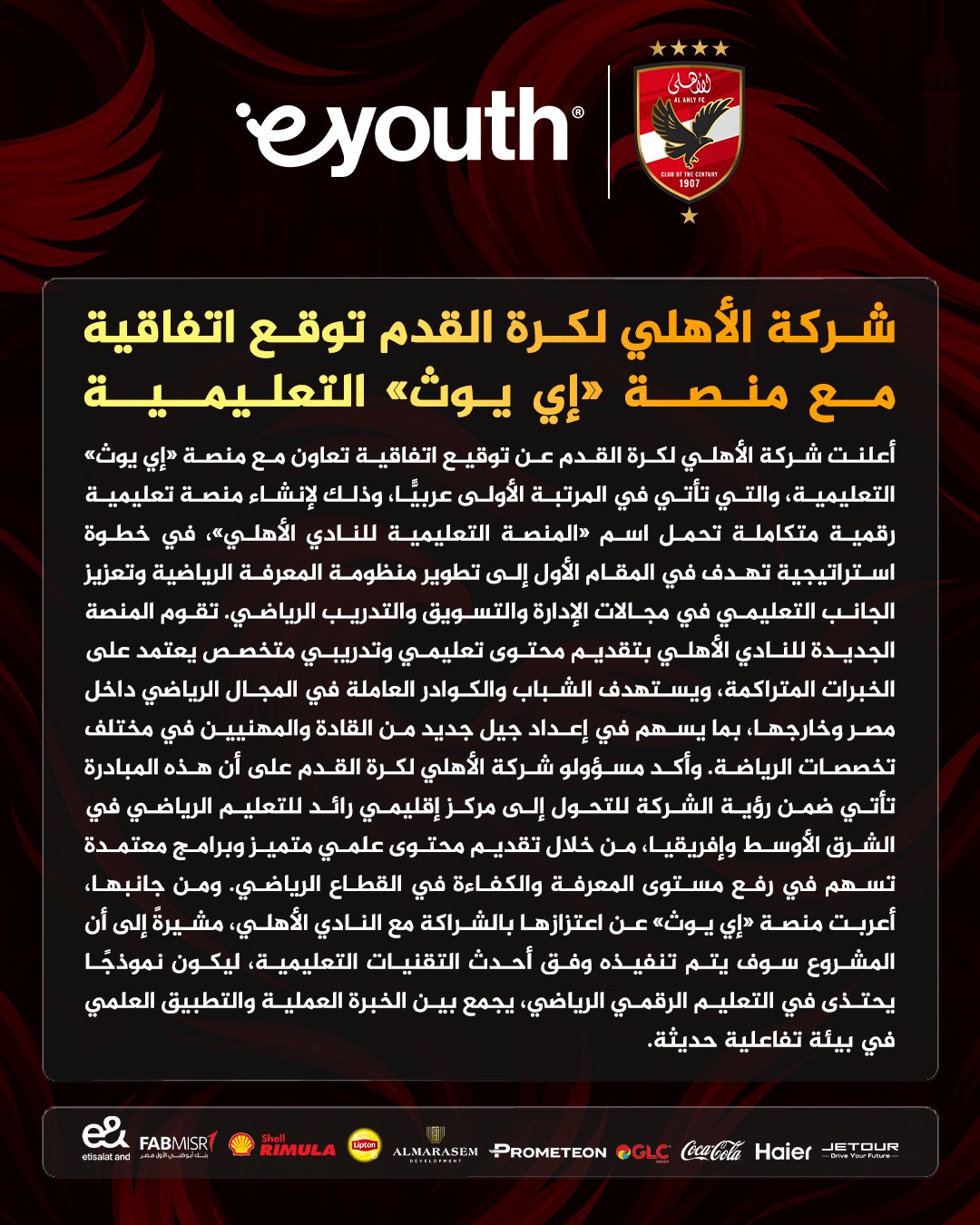 وأعربت المنصة عن اعتزازها بالشراكة مع النادي الأهلي، مشيرة إلى أن المشروع سوف يتم تنفيذه وفق أحدث التقنيات التعليمية، ليكون نموذجًا يحتذى في التعليم الرقمي الرياضي، يجمع بين الخبرة العملية والتطبيق العلمي في بيئة تفاعلية حديثة.