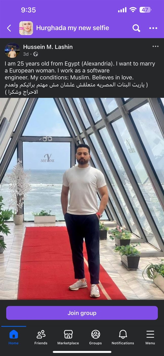 تشهد ساحة التواصل الاجتماعي خلال الساعات الأخير جدلًا واسعًا بعد أن ظهر على موقع Facebook جروب تحت اسم Hurghada my new selfie، يضم مجموعة من شباب مصريين، يعلنون فيه عن رغبتهم في التعرف على فتيات أجنبيات بغرض الزواج.