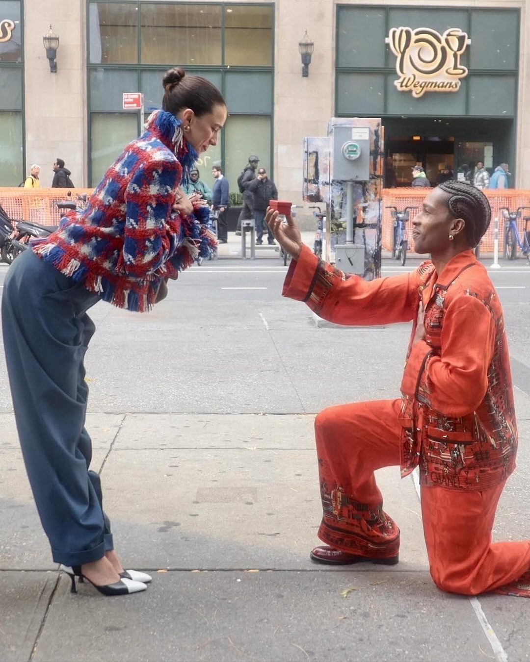 في مشهدٍ أربك المارة وأشعل مواقع التواصل الاجتماعي، شوهد كلٌّ من A$AP Rocky وMargaret Qualley في وسط Manhattan وهما يصوّران مشهدًا بدا وكأنه طلب زواج حقيقي. رُصد Rocky راكعًا على ركبته أمام الممثلة، ممسكًا بخاتمٍ في يده، لتلتقط عدسات المارة والباباراتزي اللحظة التي انتشرت بسرعة البرق على الإنترنت.