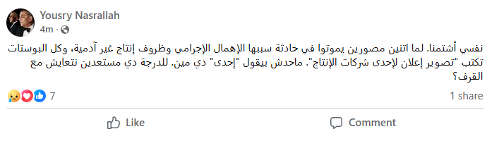 وقال يسري نصرالله في منشوره: "نفسي أشتمنا. لما اتنين مصورين يموتوا في حادثة سببها الإهمال الإجرامي وظروف إنتاج غير آدمية، وكل البوستات تكتب "تصوير إعلان لإحدى شركات الإنتاج". ماحدش بيقول "إحدى" دي مين. للدرجة دي مستعدين نتعايش مع القرف؟".