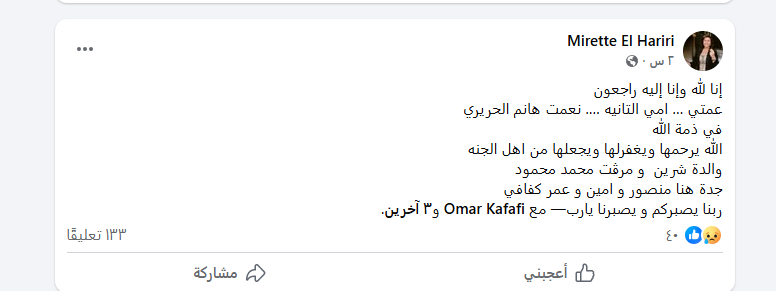 ونعت ميريت الحريري عمتها وشقيقة والدها الراحل وكتبت عبر حسابها بموقع فيسبوك: “إنا لله وإنا إليه راجعون، عمتي … امي التانيه …. نعمت هانم الحريري في ذمة الله الله يرحمها ويغفرلها ويجعلها من أهل الجنة والدة شرين ومرڤت محمد محمود جدة هنا منصور وأمين وعمر كفافي”.
