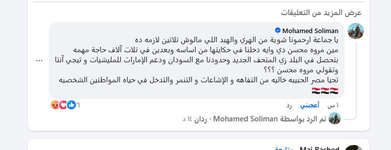 كتب محمد سليمان في تعليق له على إحدى الصفحات الفنية:"يا جماعة ارحمونا شوية من الهري والهبد اللي مالوش تلاتين لازمة ده.. مين مروة محسن دي وايه دخلنا في حكايتها من أساسه وبعدين في تلات آلاف حاجة مهمه بتحصل في البلد زي المتحف الجديد وحدودنا مع السودان ودعم الإمارات للمليشيات وتيجي أنت وتقولي مروه محسن؟ تحيا مصر الحبيبة خالية من التفاهة والإشاعات والتنمر والتدخل في حياة المواطنين الشخصية".