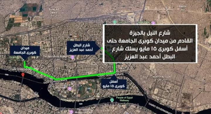 شارع النيل بالجيزة: القادم من ميدان كوبرى الجامعة حتى أسفل كوبرى ١٥مايو.. يسلك شارع البطل أحمد عبد العزيز.