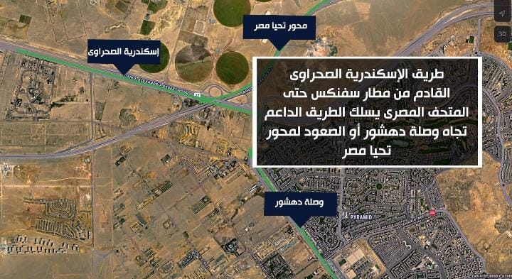 طريق الإسكندرية الصحراوى: القادم من مطار سفنكس حتى المتحف المصرى.. يسلك الطريق الداعم تجاه وصلة دهشور أو الصعود لمحور تحيا مصر.