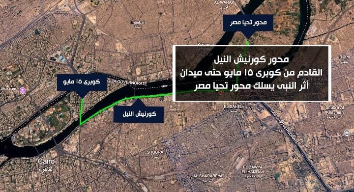 محور كورنيش النيل: القادم من كوبرى ١٥مايوحتى ميدان أثرالنبى.. يسلك محور تحيا مصر.