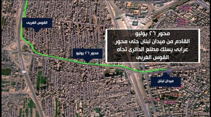 محور ٢٦يوليو: القادم من ميدان لبنان حتى محورعرابى.. يسلك مطلع الدائرى تجاه القوس الغربى.