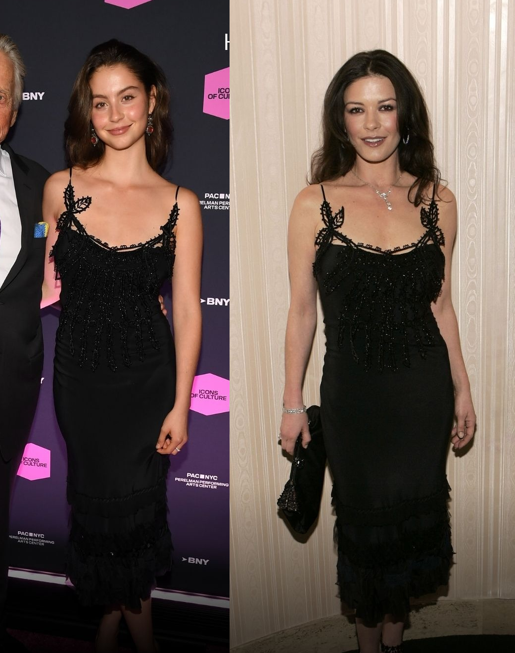 وقبل 20 عاما نسّقته كاثرين زيتا جونز مع حقيبة سوداء صغيرة لامعة وحذاء أسود بكعب عالٍ وارتدت عقد ماسي ناعم، فيما تخلت الابنة خلال أحدث ظهور لها بالفستان؛ عن العقد واكتفت بالأقراط والخواتم البسيطة.