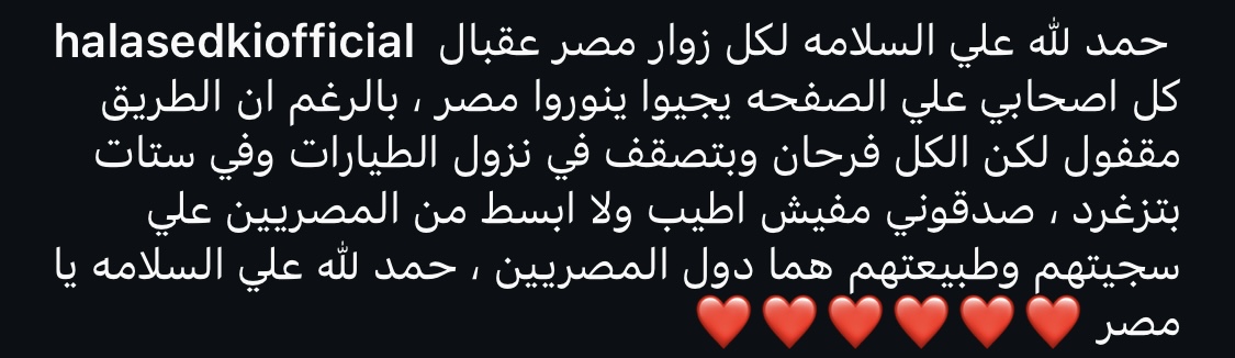 وعلقت الفنانة هالة صدقي على تلك الفيديو قائلة: “حمد لله على السلامة لكل زوار مصر عقبال كل اصحابي على الصفحة يجيوا ينوروا مصر، بالرغم أن الطريق مقفول لكن الكل فرحان وبتصقف في نزول الطيارات وفي ستات بتزغرد، صدقوني مفيش اطيب ولا ابسط من المصريين علي سجيتهم وطبيعتهم هما دول المصريين ، حمد لله على السلامة يا مصر”.