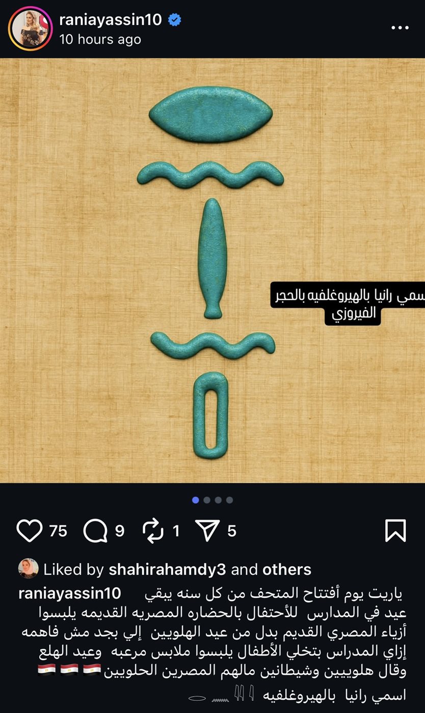 وعلقت الفنانة رانيا محمود ياسين عليهم قائلة: “ياريت يوم أفتتاح المتحف من كل سنة يبقي عيد في المدارس للأحتفال بالحضارة المصرية القديمة يلبسوا أزياء المصري القديم بدل من عيد الهلويين اللي بجد مش فاهمة إزاي المدراس بتخلي الأطفال يلبسوا ملابس مرعبة وعيد الهلع وقال هلوييين وشيطانين مالهم المصرين الحلويين”.