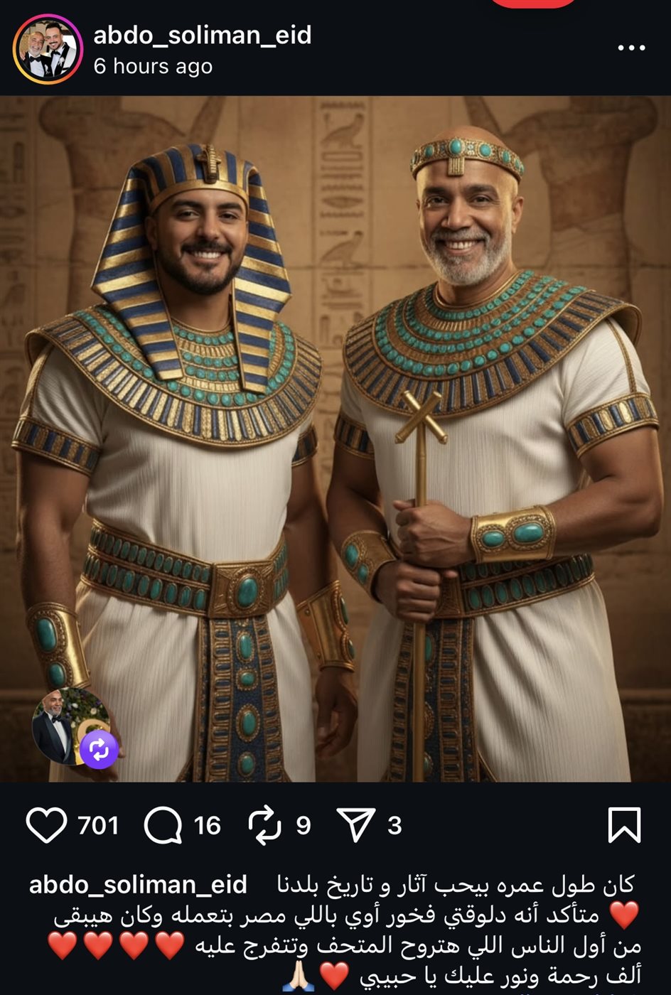 فنشر المخرج عبد الرحمن عيد نجل سليمان عيد صورة تجمعهما بالزي الفرعوني عبر حسابه الرسمي على موقع تبادل الصور والفيديوهات إنستجرام، وعلق عليها قائلًا: “كان طول عمره بيحب آثار وتاريخ بلدنا، متأكد أنه دلوقتي فخور أوي باللي مصر بتعمله، وكان هيبقى من أول الناس اللي هتروح المتحف وتتفرج عليه، ألف رحمة ونور عليك يا حبيبي”.